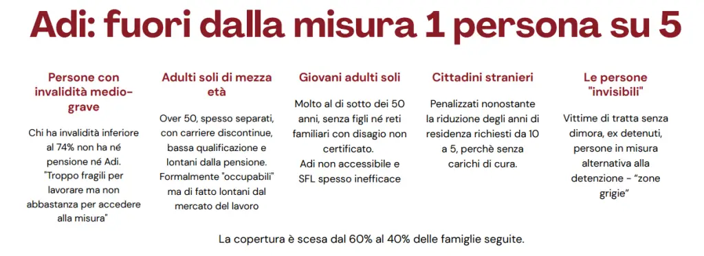 Restano esclusi soprattutto: famiglie in età da lavoro senza figli minori, lavoratori poveri, stranieri, chi vive nel Centro-Nord, dove oggi si concentra il 41% delle famiglie povere ma solo il 15% dei percettori dell’ADI.