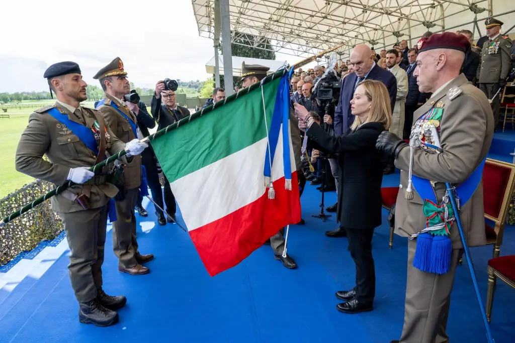 “Italian Prime Minister Giorgia Meloni decorates the flag of the Italian Army’s 21st Field Artillery Regiment ‘Trieste'” by Italian Army is licensed under CC BY 2.5.
