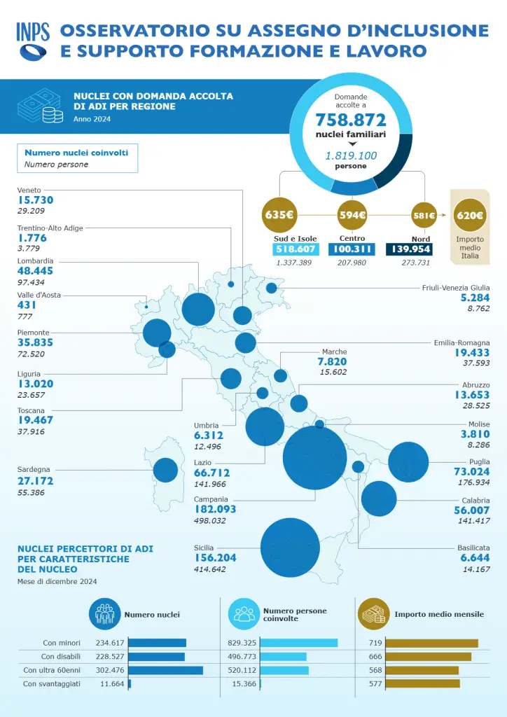 Dai dati pubblicati dall’Inps, si apprende che alla data del 31 dicembre 2024, i nuclei familiari con domanda accolta per l’Assegno di Inclusione sono stati poco meno di 760 mila, coinvolgendo complessivamente 1,82 milioni di persone.