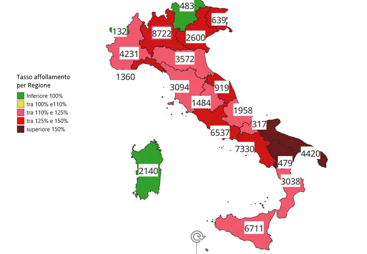Ma il dato che resta sempre allarmante è quello del sovraffollamento: l’indice di affollamento complessivo nella regione al 30 giugno 2024, calcolato sulla capienza regolamentare è pari al 130,3% e al 143,1%, se tale indicatore viene calcolato sul numero effettivo di posti disponibili. In tutta Italia i valori risultano pari al 120% sulla capienza “ufficiale” e al 129,3% sul numero di posti effettivamente disponibili.